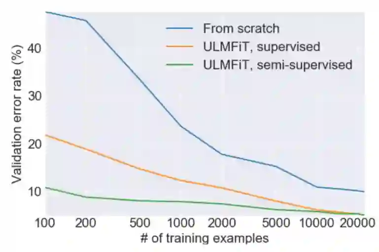 这种想法已经有人尝试过了,但是需要数百万的文件才能达到较好的性能。我们发现,通过更聪明地微调我们的语言模型,就能做的更好。特别地,我们发现,如果我们能够控制模型训练的速度,并对预训练模型进行更新,使其不会遗忘它先前学习的特征,从而模型能够更好地适应新的数据集。让我们感到惊喜的是,我们发现这个模型甚至能从非常有限的样本中学习。在一个二元的文本分类问题中,我们发现,仅使用 100 个有标记样本(以及 50000 个无标记样本),就能达到和使用 10000 个有标记样本从头开始训练一样的效果。