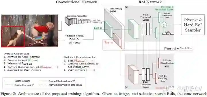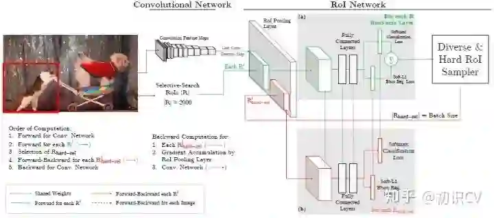总结来说,对于给定图像,经过selective search RoIs,同样计算出卷积特征图。但是在绿色部分的(a)中,一个只读的RoI网络对特征图和所有RoI进行前向传播,然后Hard RoI module利用这些RoI的loss选择B个样本。在红色部分(b)中,这些选择出的样本(hard examples)进入RoI网络,进一步进行前向和后向传播。