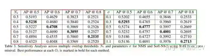 左边一半(红色框)是NMS,右边一半(绿色框)是Soft NMS。在NMS部分,相同 (置信度阈值)条件下( 较小的情况下),基本上 值越大,其AP值越小。这主要是因为 值越大,有越多的重复框没有过滤掉。