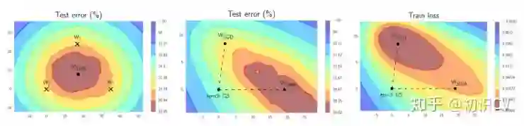 左图:W1、W2、W3分别代表3个独立训练的网络,Wswa为其平均值。中图:WSWA 在测试集上的表现超越了SGD。右图:WSWA 在训练时的损失比SGD要高。