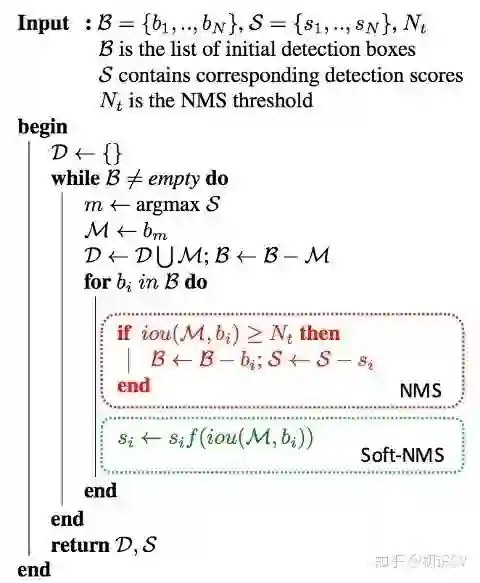 NMS(Non-Maximum Suppression,非极大抑制)是检测模型的标准后处理操作,用于去除重合度(IoU)较高的预测框,只保留预测分数最高的预测框作为检测输出。Soft NMS由[6]提出。在传统的NMS中,跟最高预测分数预测框重合度超出一定阈值的预测框会被直接舍弃,作者认为这样不利于相邻物体的检测。提出的改进方法是根据IoU将预测框的预测分数进行惩罚,最后再按分数过滤。配合Deformable Convnets(将在之后的文章介绍),Soft NMS在MS COCO上取得了当时最佳的表现。算法改进如下: