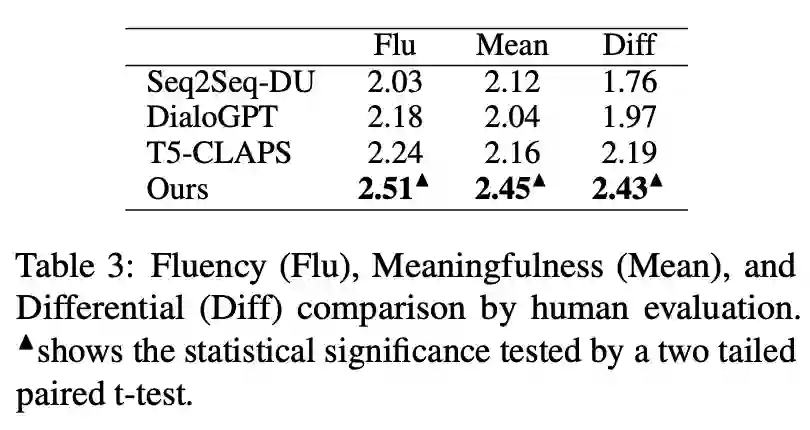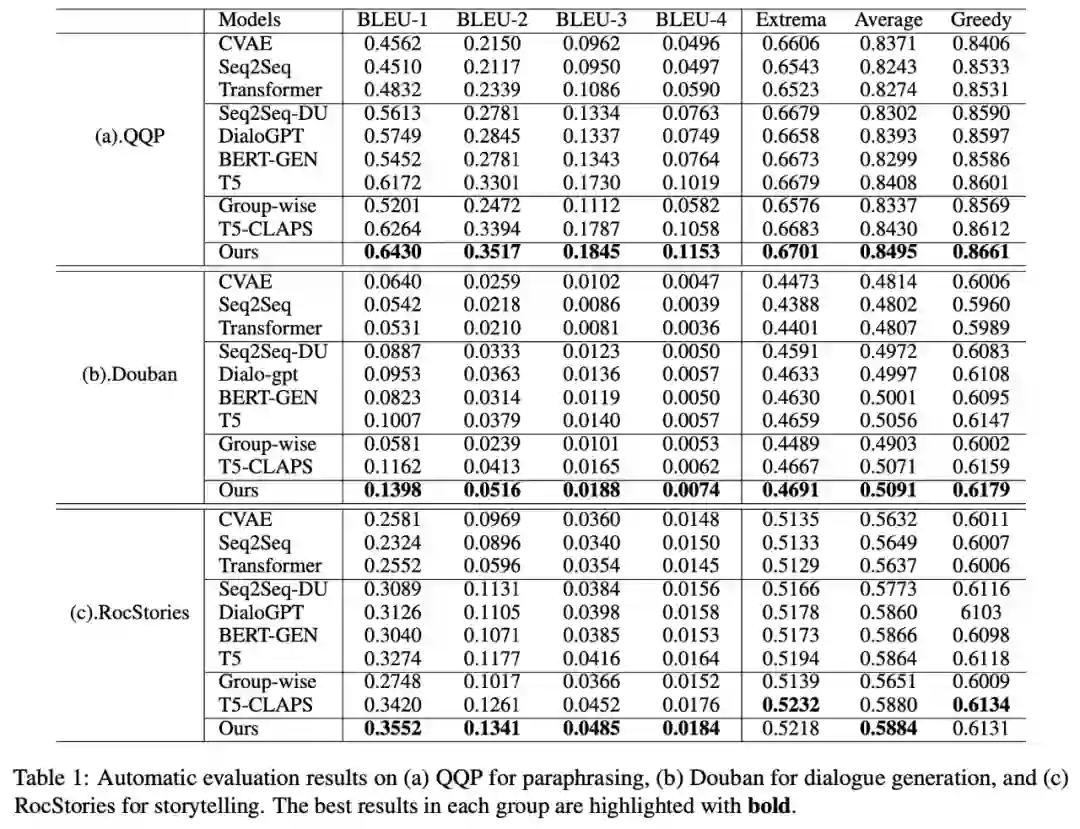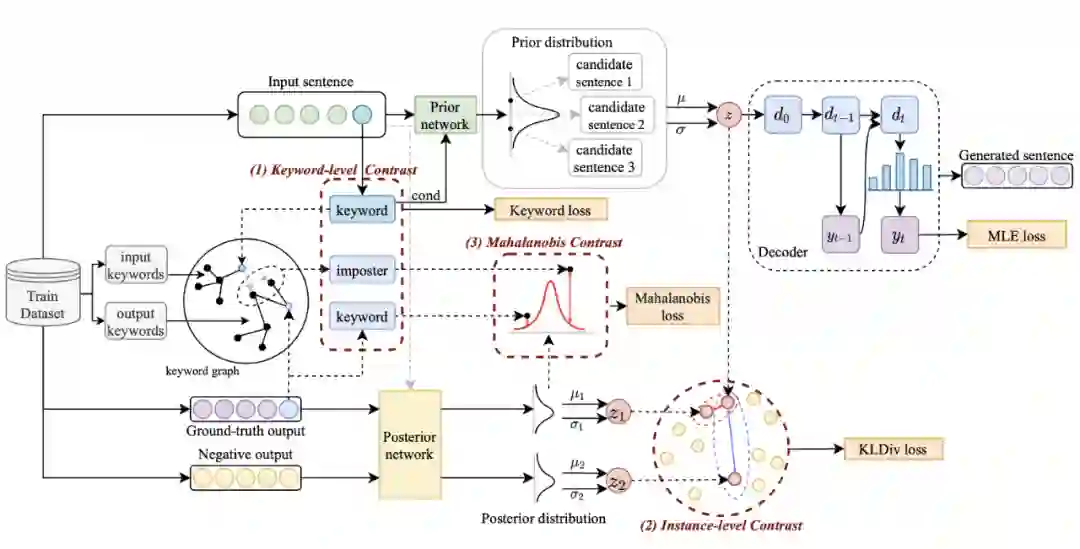 [2] Hengyi Cai, Hongshen Chen, Yonghao Song, Zhuoye Ding, Yongjun Bao, Weipeng Yan, and Xiaofang Zhao. 2020. Group-wise contrastive learning for neural dialogue generation. In Proceedings of the 2020 Conference on Empirical Methods in Natural Language Processing: Findings, EMNLP 2020.[3] Jiwei Li, Minh-Thang Luong, and Dan Jurafsky. 2015. A hierarchical neural autoencoder for paragraphs and documents. arXiv preprint.[4] Meng-Hsuan Yu, Juntao Li, Zhangming Chan, Dongyan Zhao, and Rui Yan. 2021. Content learning with structure-aware writing: A graph-infused dual conditional variational autoencoder for automatic storytelling. In Proceedings of the AAAI Conference on Artificial Intelligence.[5] Solomon Kullback and Richard A Leibler. 1951. On information and sufficiency. The annals of mathematical statistics.[6] Rada Mihalcea and Paul Tarau. 2004. Textrank: Bringing order into text. In Proceedings of the 2004 conference on empirical methods in natural language processing.[7] Jacob Devlin, Ming-Wei Chang, Kenton Lee, and Kristina Toutanova. 2018. Bert: Pre-training of deep bidirectional transformers for language understanding. arXiv preprint.[8] Roy De Maesschalck, Delphine Jouan-Rimbaud, and Désiré L Massart. 2000. The mahalanobis distance. Chemometrics and intelligent laboratory systems.[9] Hengyi Cai, Hongshen Chen, Yonghao Song, Zhuoye Ding, Yongjun Bao, Weipeng Yan, and Xiaofang Zhao. 2020. Group-wise contrastive learning for neural dialogue generation. In Proceedings of the 2020 Conference on Empirical Methods in Natural Language Processing: Findings, EMNLP 2020.[10] Shankar Iyer, Nikhil Dandekar, and Kornel Csernai. 2017. First quora dataset release: Question pairs.[11] Alex Wang, Amanpreet Singh, Julian Michael, Felix Hill, Omer Levy, and Samuel R. Bowman. 2019. GLUE: A multi-task benchmark and analysis platform for natural language understanding. In the Proceedings of ICLR.[12] Nasrin Mostafazadeh, Nathanael Chambers, Xiaodong He, Devi Parikh, Dhruv Batra, Lucy Vanderwende, Pushmeet Kohli, and James Allen. 2016. A corpus and cloze evaluation for deeper understanding of commonsense stories. In Proceedings of the 2016 Conference of the North American Chapter of the Association for Computational Linguistics: Human Language Technologies.[13] Tiancheng Zhao, Ran Zhao, and Maxine Eskenazi. 2017. Learning discourse-level diversity for neural dialog models using conditional variational autoencoders. arXiv preprint.[14] Ilya Sutskever, Oriol Vinyals, and Quoc V. Le. 2014. Sequence to sequence learning with neural networks. In Advances in Neural Information Processing Systems 27: Annual Conference on Neural Information.[15] Ashish Vaswani, Noam Shazeer, Niki Parmar, Jakob Uszkoreit, Llion Jones, Aidan N. Gomez, Lukasz Kaiser, and Illia Polosukhin. 2017. Attention is all you need. In Advances in Neural Information Processing Systems 30: Annual Conference on Neural Information Processing Systems 2017.[16] Yue Feng, Yang Wang, and Hang Li. 2021. A sequence-to-sequence approach to dialogue state tracking. ACL 2021.[17] Yizhe Zhang, Siqi Sun, Michel Galley, Yen-Chun Chen, Chris Brockett, Xiang Gao, Jianfeng Gao, Jingjing Liu, and Bill Dolan. 2020. Dialogpt: Large-scale generative pre-training for conversational response generation. In ACL, system demonstration.[18] Colin Raffel, Noam Shazeer, Adam Roberts, Katherine Lee, Sharan Narang, Michael Matena, Yanqi Zhou, Wei Li, and Peter J. Liu. 2020. Exploring the limits of transfer learning with a unified text-to-text transformer. J. Mach. Learn. Res.[19] Seanie Lee, Dong Bok Lee, and Sung Ju Hwang. 2021.Contrastive learning with adversarial perturbations for conditional text generation. In 9th International Conference on Learning Representations, ICLR 2021.[20] Kishore Papineni, Salim Roukos, Todd Ward, and Wei-Jing Zhu. 2002. Bleu: a method for automatic evaluation of machine translation. In ACL.[21] Xiaodong Gu, Kyunghyun Cho, Jung-Woo Ha, and Sunghun Kim. 2019. DialogWAE: Multimodal response generation with conditional wasserstein autoencoder. In International Conference on Learning Representations.[22] Laurens van der Maaten and Geoffrey Hinton. 2008. Visualizing data using t-sne. Journal of machine learning research.