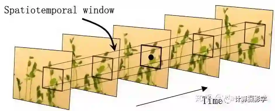 因此,作者提出可以在时间和空间上构成滑动窗口,并在窗口内对图像中进行平滑,下图是作者提到的“时空窗口”示意,黑色点是需要计算的像素点,计算是在一个时间帧和空间区域构成的立方体上进行的。