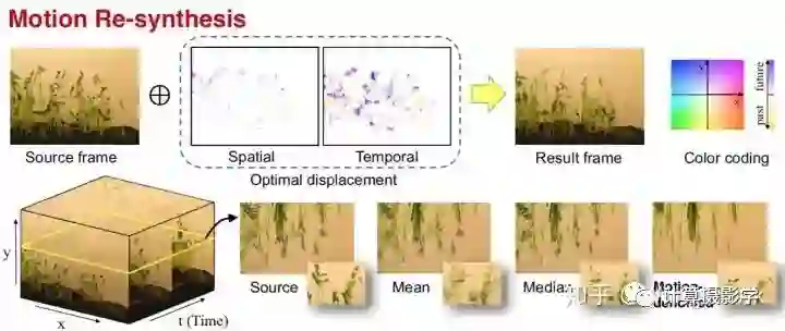 • 视频重合成:该方法通过最优化思想求得位移场后,对输入帧用位移场进行位移获取到对应的输出帧,并将输出帧进行合成,从而得到新的视频。这种方法能得到远好于最基础的时域图像滤波技术处理的视频。