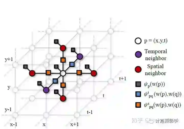 为了得到输出视频,就需要求得输入视频所对应的位移场w。而要求得w,则需要最小化E(w), 这样这个问题就被转换为了一个最优化的问题。这里,由于每个像素在空间和时间上都有相关关系,所以作者在3D MRF空间上进行了最优化: