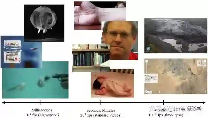人们通常用摄影设备来捕捉真实的世界,而真实的世界中每时每刻都在上演千变万化的事件。从图像所记录的事件的时间尺度上来区分,我们既能记录发生在毫秒级别的事件,例如子弹离开枪口的瞬间,也能够记录长达数月甚至数年的变化,例如城市的卫星图像的变化,地球表面的变化,也有一些常规的事件发生在数秒钟或者数分钟内,例如脉搏的跳动,人的呼吸,等等。下图总结了一些常见的时间尺度中发生的事件: