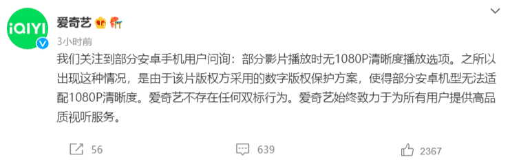 有网友称,爱奇艺《魔法满屋》在苹果手机、电脑客户端均支持1080p,只有安卓手机不支持。爱奇艺回应称,不存在双标。之所以出现这种情况,是由于该片版权方采用的数字版权保护方案,使得部分安卓机型无法适配1080P清晰度。(第一财经)