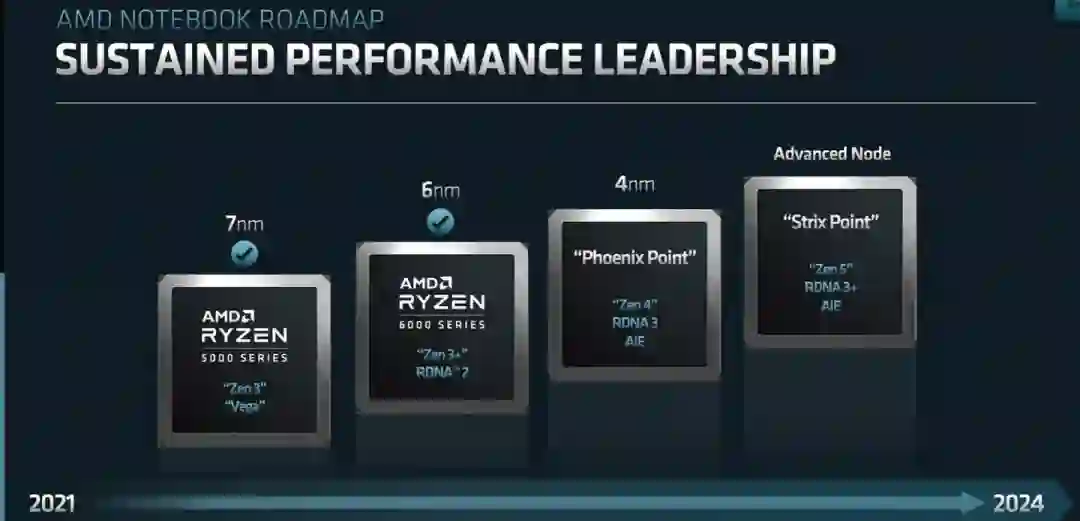 【AMD预览新一代移动处理器】AMD公布新一代移动CPU代号“Phoenix Point”,采用4nm工艺、Zen4架构,配备RDNA3 GPU,拥有AIE引擎。此外,还公布了其新款Genoa-X霄龙处理器,最高96核,L3缓存超1GB。(IT之家)