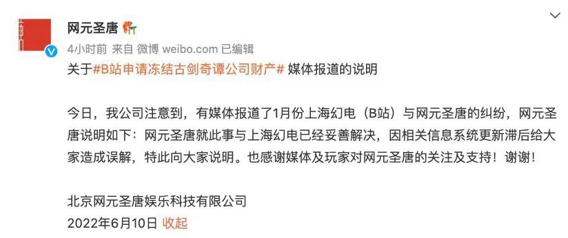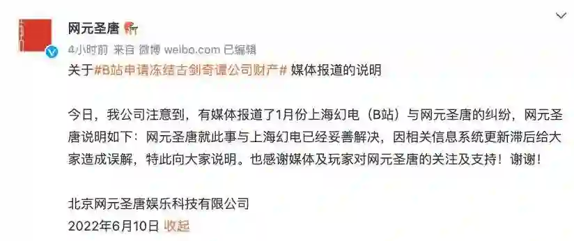 有报道称,B站申请冻结古剑奇谭公司网元圣唐的3000万财产。对此,网元圣唐发布通告说明,就此事与上海幻电已经妥善解决,因相关信息系统更新滞后给大家造成误解。(快科技)