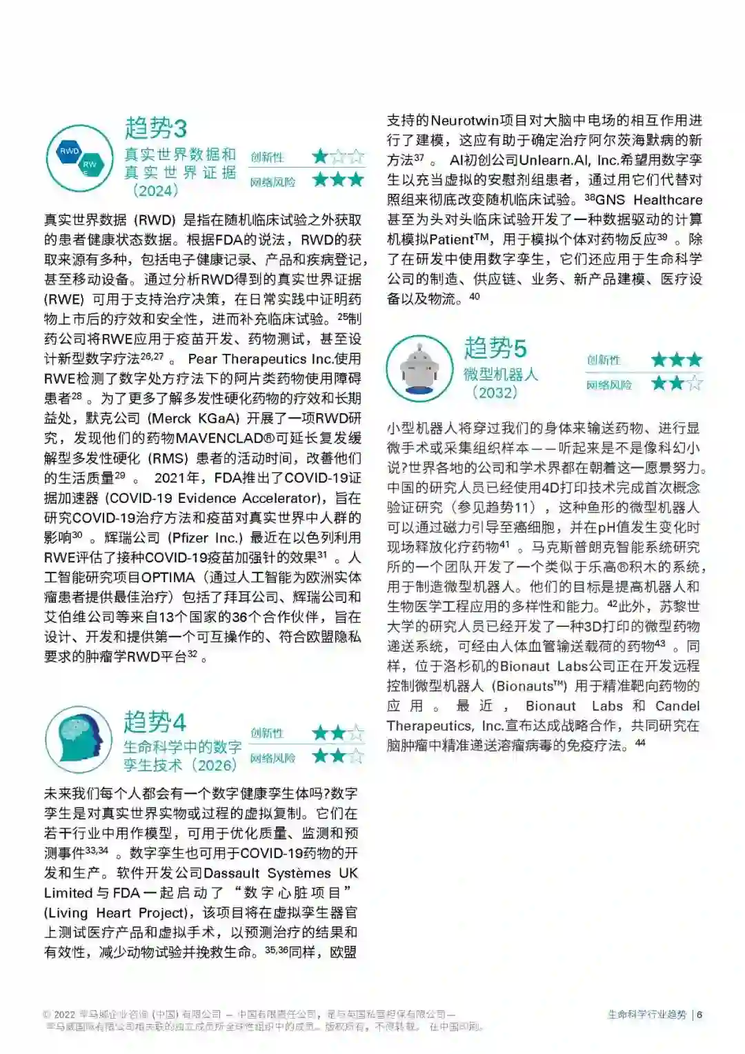 随着信息技术的发展,数字化和数字变得越来越受生命科学企业的关注,如果能用的数据越多,竞争就会从谁掌握最好的数据转向谁能最好地分析数据。本报告的前两版(2020年和2021年)识别了70多个生命科学趋势,包括主要的数据驱动型创新。而且,更多令人兴奋的趋势正在生命科学领域不断涌现,涵盖了基于人工智能(AI)的智能植入物、智能联网诊断设备、区块链技术的使用、分散化生产以及工业5.0等等。