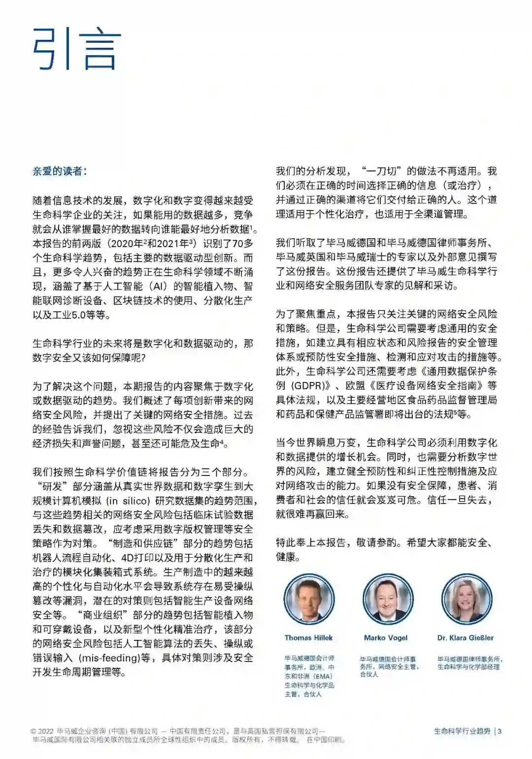 我们听取了毕马威德国和毕马威德国律师事务所、毕马威英国和毕马威瑞士的专家以及外部意见撰写了这份报告。这份报告还提供了毕马威生命科学行业和网络安全服务团队专家的见解和采访。