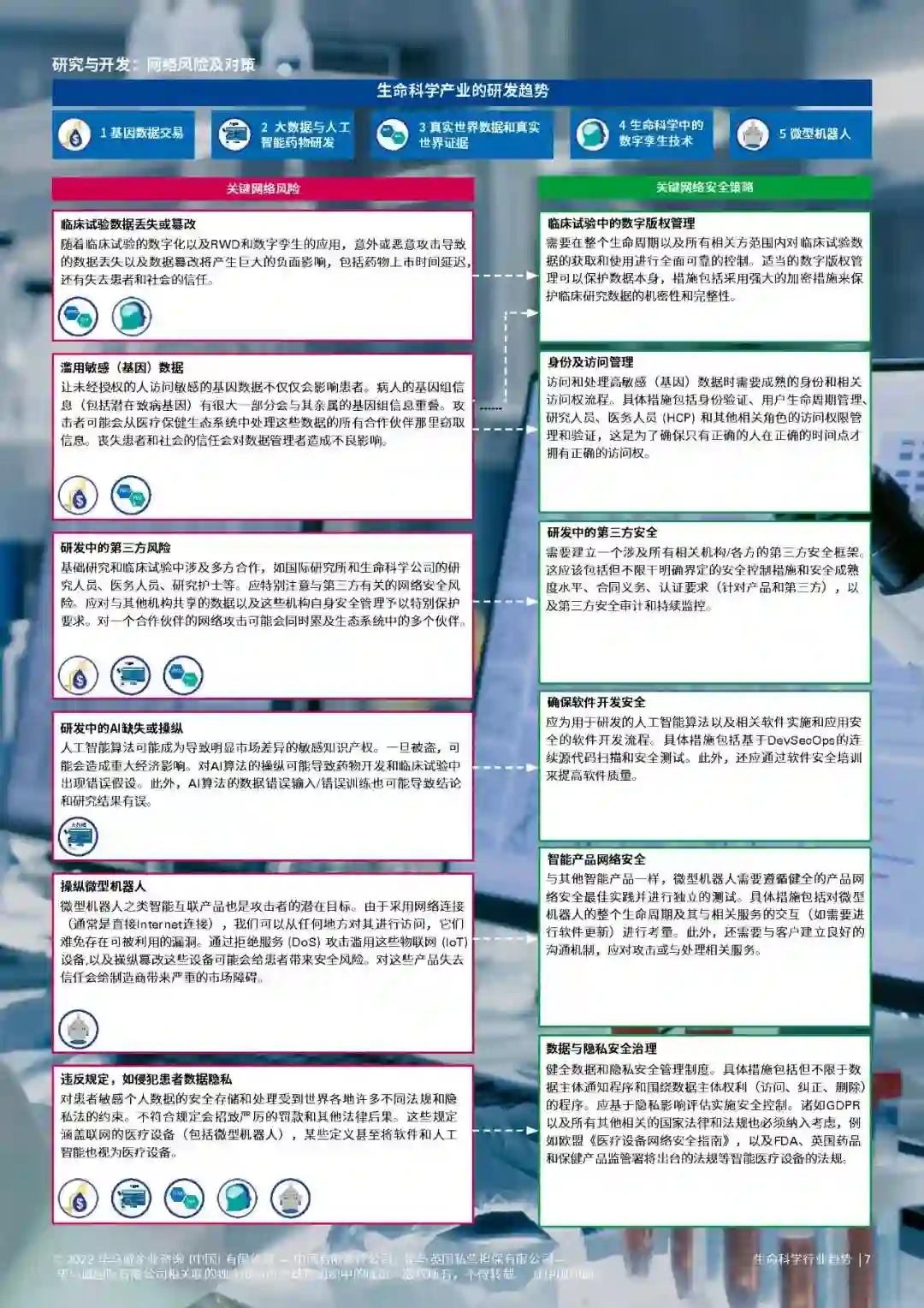 为了聚焦重点,本报告只关注关键的网络安全风险和策略。但是,生命科学公司需要考虑通用的安全措施,如建立具有相应状态和风险报告的安全管理体系或预防性安全措施、检测和应对攻击的措施等。此外,生命科学公司还需要考虑《通用数据保护条例(GDPR)》、欧盟《医疗设备网络安全指南》等具体法规,以及主要经营地区食品药品监督管理局和药品和保健产品监管署即将出台的法规等。