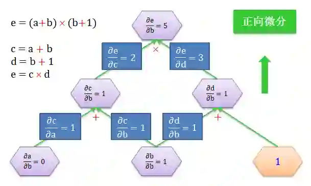 从 b 开始正向往上计算所有节点上的变量对 b 的导数,该操作叫做正向微分 (forward-mode differentiation)
