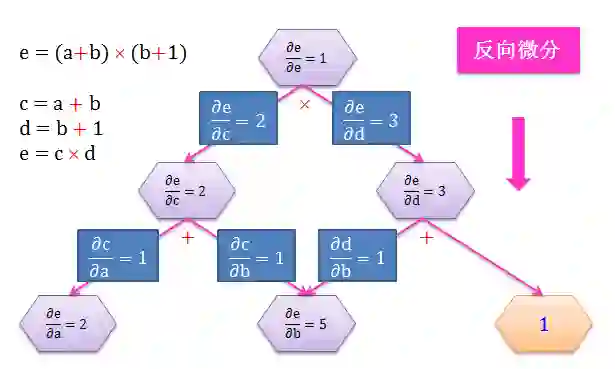 从 e 开始反向往下计算 e 对所有节点上的变量的导数,该操作叫做反向微分 (backward-mode differentiation)