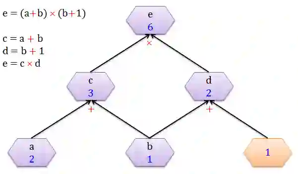 用 c = a + b,d = b + 1 的代换,画出下面的计算图 (computational graph)。图中有三个运算符:2 个加法 (+) 和 1 个乘法 (×)。紫色六边形里面的是变量,橙色六边形里面是常数。
