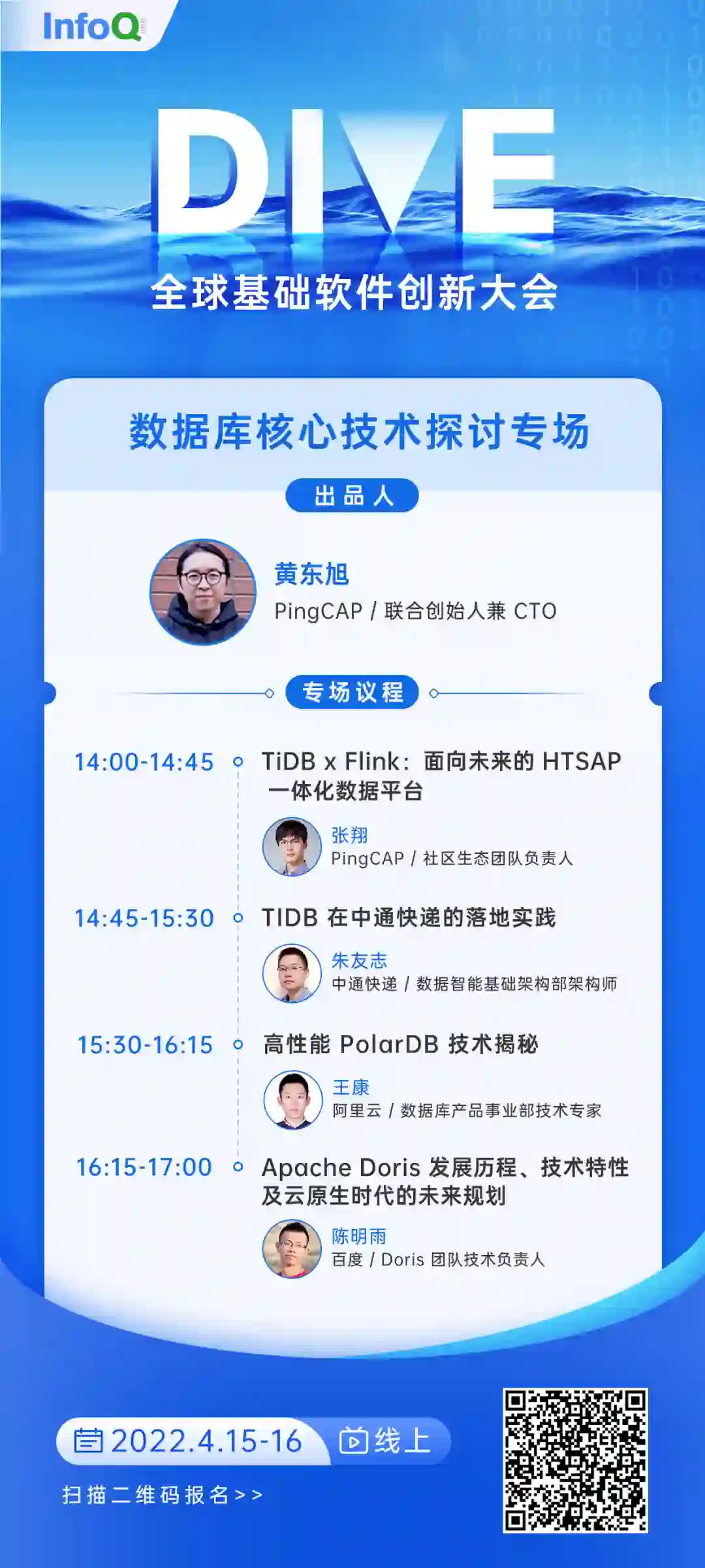 那么,目前行业具体是如何实践,数据库技术未来又将如何发展呢?在 4 月 15、16 日,DIVE 全球基础软件创新大会(线上)上,「数据库核心技术」专场邀请 PingCAP 联合创始人兼 CTO 黄东旭担任出品人,携手来自 PingCAP 社区、中通快递、阿里云数据库、百度 Doris 团队的四位专家,与大家一起探讨数据库核心技术的发展,亲自分享各自的实战经验!
