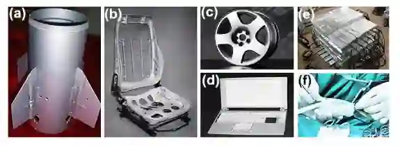 图2.1镁合金的应用示例 (a) 轻型导弹壳;(b) 座椅框架;(c) 汽车轮毂;(d) 笔记本外壳;(e) 牺牲阳极材料;(f) 医用镁合金缝合线