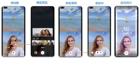 通过“举手”“翻转”“握拳”“滑动”“OK”共五种隔空手势,即可完成 Vlog 的隔空拍摄。另外还准备了简单易操作的一键拍功能,用户一键点击,即可跟随手机内置的拍摄模板拍摄 Vlog 作品。