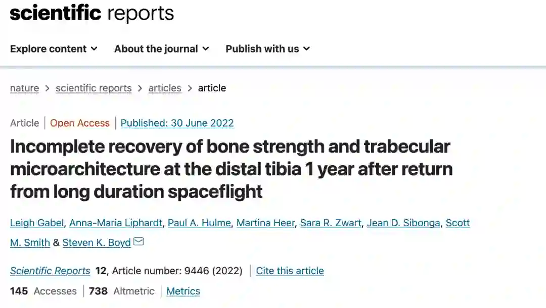 相关研究论文以“ncomplete recovery of bone strength and trabecular microarchitecture at the distal tibia 1 year after return from long duration spaceflight”为题,已发表在科学期刊《科学报告》(Scientific Reports)上。