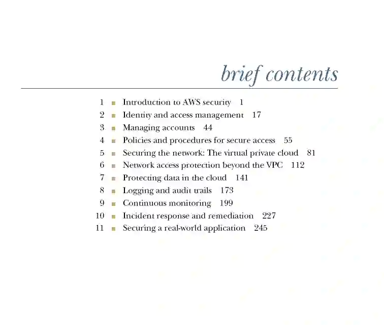 本书共分为11章。它从核心服务中的最佳实践开始,然后转移到更一般的主题,如威胁检测和事件响应。最后,本文将使用从本书中学到的技能来演示一个示例应用程序: