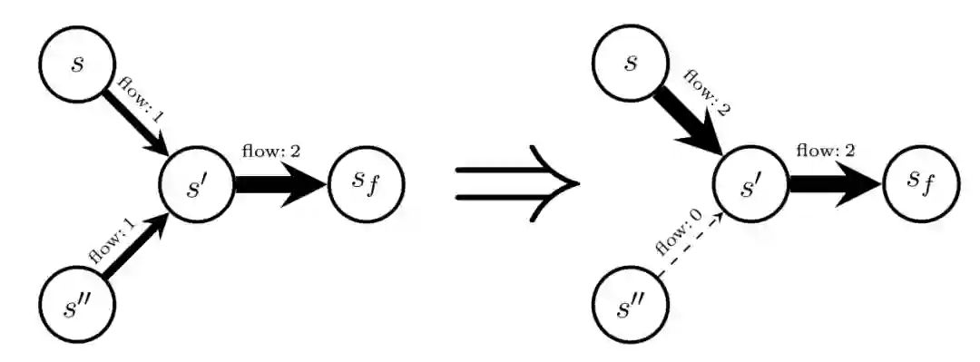 流的一个显著特性是:如果满足细致平衡或流匹配条件,则可以从初始状态流 F(s_0) 恢复归一化常数 Z(推论 3)。Z 还提供了与指定了终端转换流的给定终端奖励函数 R 相关联的配分函数(partition function)。下图展示了如何条件化 GFlowNet,给定状态 s,考虑通过原始流(左)和转移流来创建一组新的流(右)。