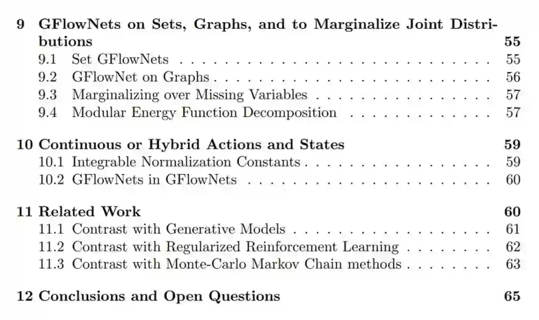 本文的一个重要贡献是条件 GFlowNet 的概念,可用于计算不同类型(例如集合和图)联合分布上的自由能。这种边缘化还可以估计熵、条件熵和互信息。GFlowNets 还可以泛化,用来估计与丰富结果 (而不是一个纯量奖励函数) 相对应的多个流,这类似于分布式强化学习。