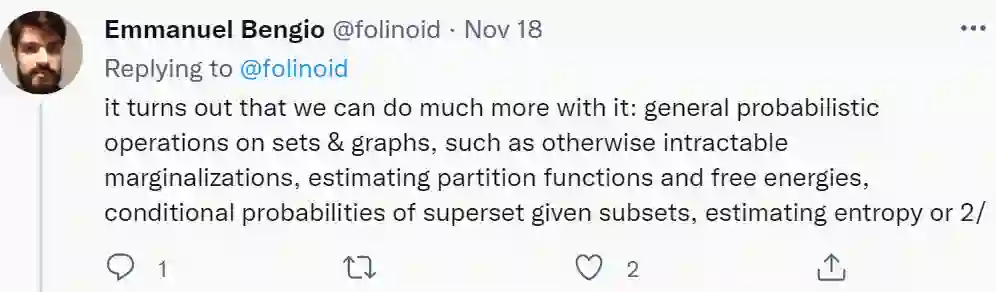 至于 GFlowNets 作用,论文作者之一 Emmanuel Bengio 也给出了一些回答:「我们可以用 GFlowNets 做很多事情:对集合和图进行一般概率运算,例如可以处理较难的边缘化问题,估计配分函数和自由能,计算给定子集的超集条件概率,估计熵、互信息等。」