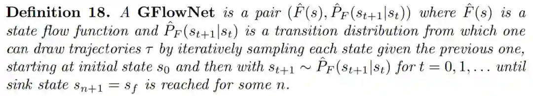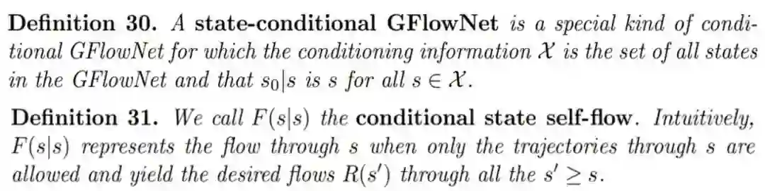 状态条件式 GFlowNet 的定义如下,并且将 F(s|s)定义为 conditional state self-flow。