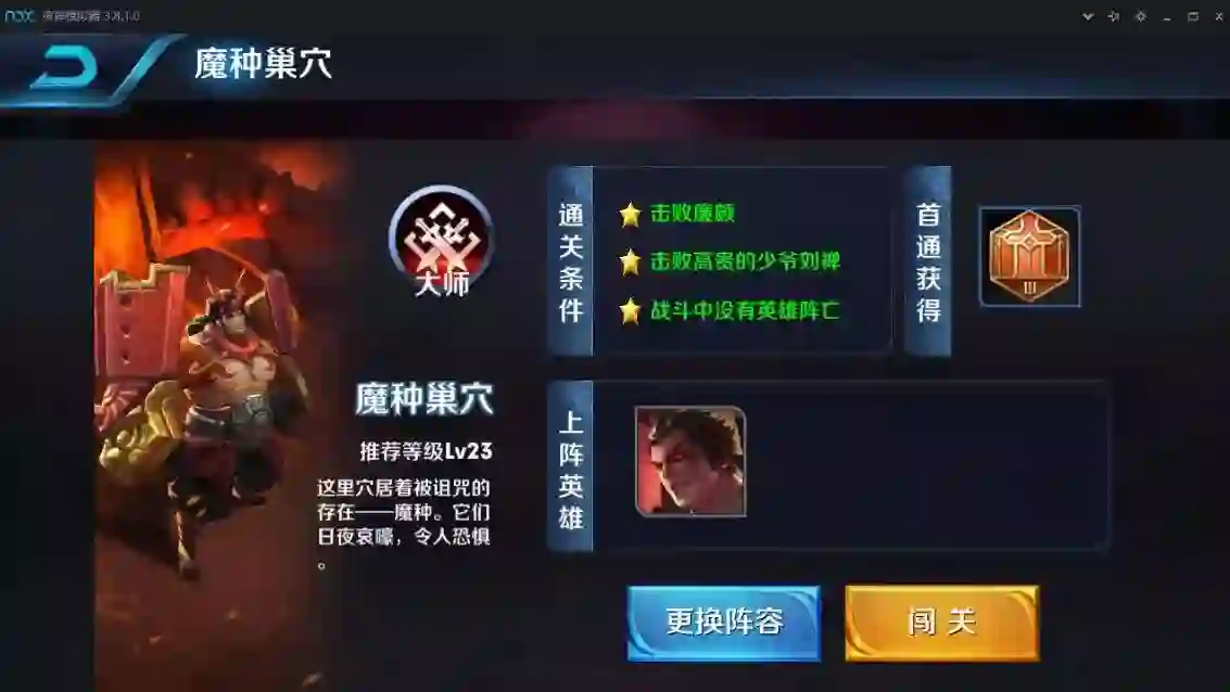 方法:进入游戏挑战模式(魔种巢穴)。上阵英雄改为吕布。打开软件点击GO