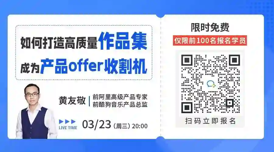为了最能直接证明自己的能力,入得了面试官的法眼。3月23日(周三)晚8点,前阿里高级产品专家@黄友敬老师带你拆解准备产品作品集的要点,掌握加分项buff顺利拿offer!