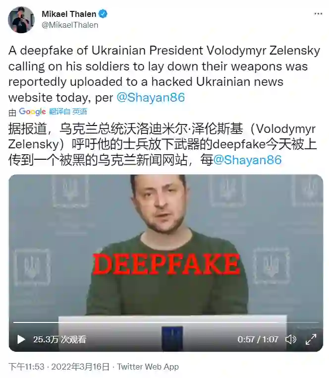 这个视频作为战争状态下第一个针对一国元首的Deepfake视频,预示着一种新的舆论战形式。