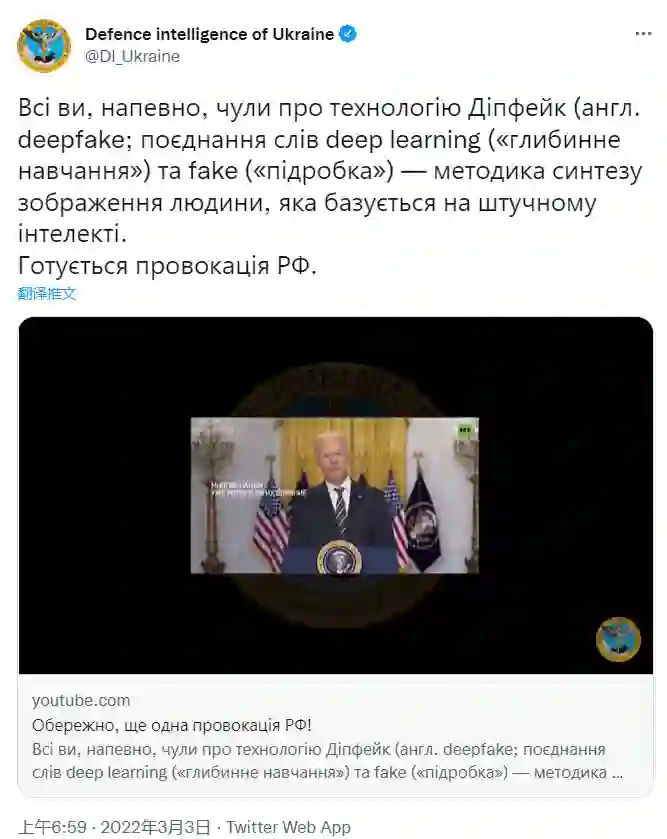 这个月初,乌克兰国防情报还专门在推特向大家科普什么是Deepfake,在科普视频中,包括美国现任总统拜登等多国政要都以Fake形象出镜。