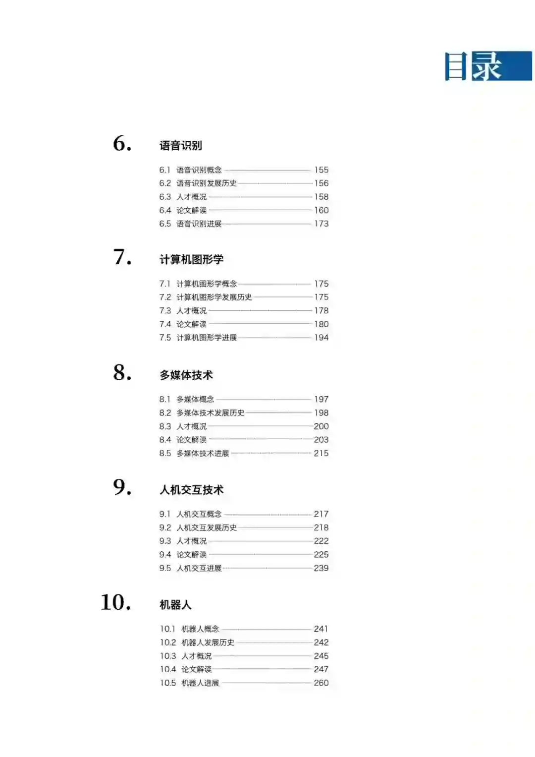 该报告力图综合展现中国乃至全球人工智能重点领域发展现状与趋势,助力产业健康发展,服务国家战略决策。报告内容涵盖了人工智能13个子领域,包括:机器学习、知识工程、计算机视觉、自然语言处理、语音识别、计算机图形学、多媒体技术、人机交互、机器人、数据库技术、可视化、数据挖掘、信息检索与推荐。