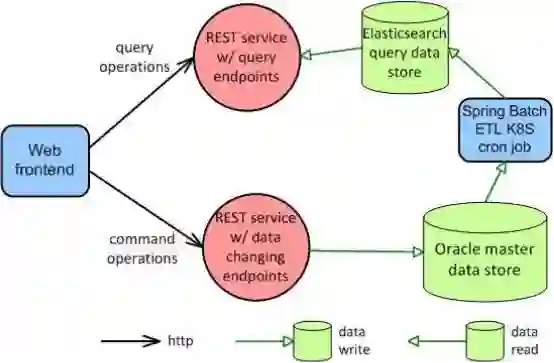 日常工作中常用的 CQRS 设计如下图所示。我们可以使用运行在集中式 Oracle 数据库上的 REST 服务处理操作更改数据的 HTTP 请求(这种情况下,该服务仍使用各微服务对应的数据库)。只读 HTTP 请求会转入不同的后端服务,再由这些后端服务从基于 Elasticsearch 文本的数据存储处读取数据。定期执行 Spring Batch Kubernetes cron 作业以根据 Oracle DB 上执行的数据变更操作,对 Elasticsearch 存储内容进行更新。这种设置使得两套数据存储之间始终保持最终一致性;而且即使 Oracle DB 或者 cron 作业失效,查询服务也仍然可用。