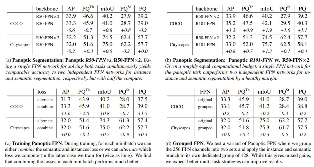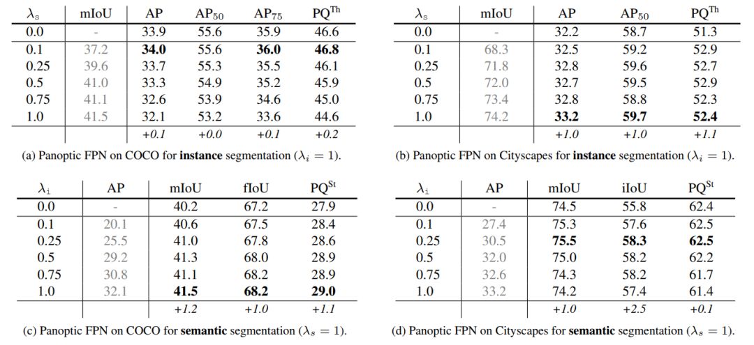 表 2:多任务训练:(a,b) 在单任务基线上增加一个语义分割分支并适当调整λs(加粗部分),能够略微改善实例分割的结果。注意,λs 是指分配给语义分割损失的权重,λs=0.0 作为单任务基线。(c,d) 在单任务基线上增加一个实例分割分支并适当调整λi(加粗部分),能够给语义分割带来更大改善。和之前一样,λi 是指分配给实例分割损失的权重,λi = 0.0 被用作单任务基线。
