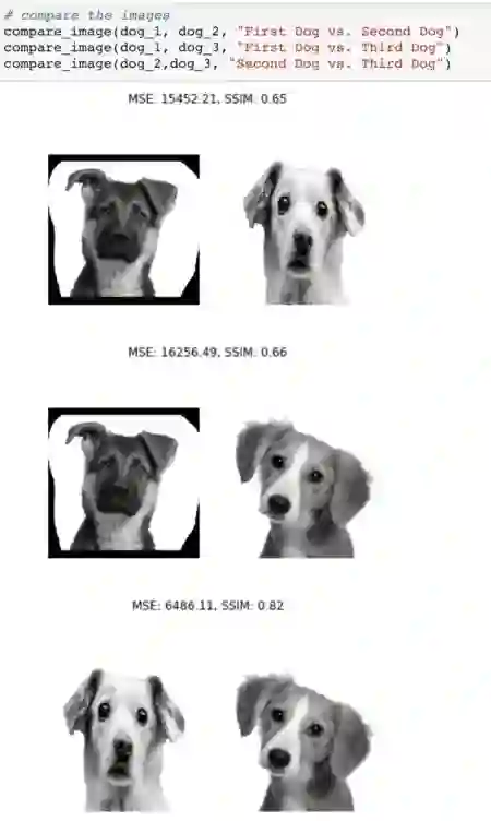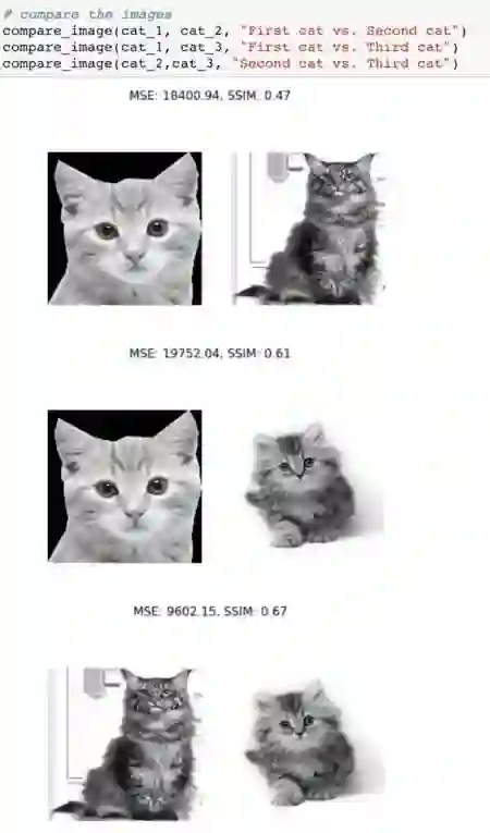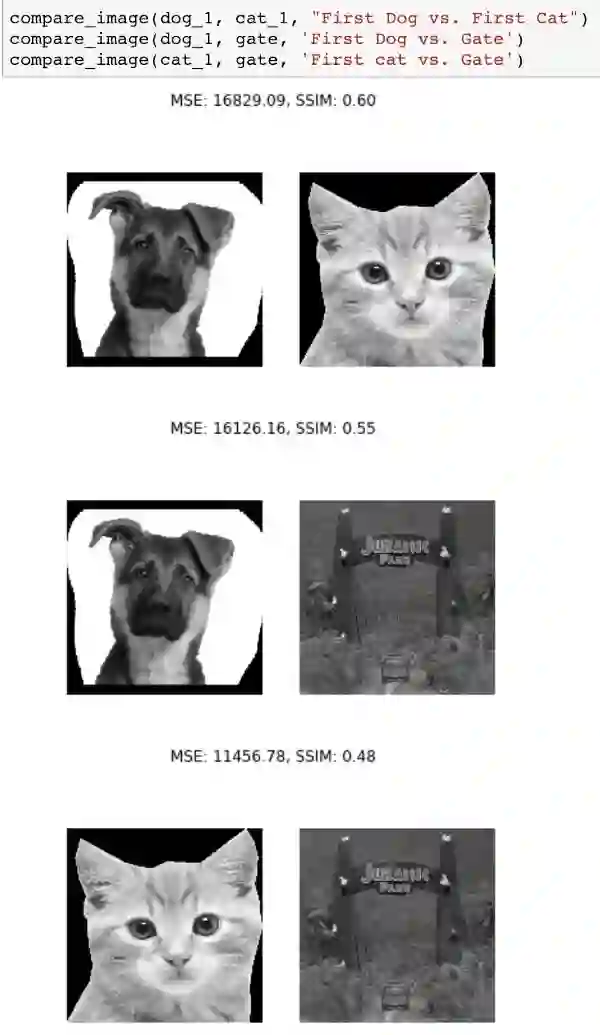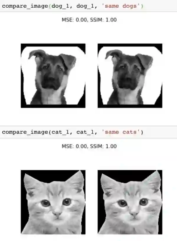 下面看看两种算法的性能比较。正如所看到的那样,MSE的值变化很大,因此该值很难说明其表达的意思是什么。但从SSIM的结果看出,可以看到狗2和狗3相对于其他狗的图像最为相似。从视觉上来讲,我同意这个结果,因为两只狗的耳朵非常像。但我还会认为狗1和狗3会有更高的SSIM值,因为二者的姿势也很相似。实际上,在图像没有进行灰度处理之前,狗2和狗3在鼻子区域周围有类似的白色毛皮,而狗1没有。这很可能是狗2和3具有比狗1更高的SSIM值的原因。对于猫来说,这就有点困难。猫1和猫2具有相似的形状,并且图像是从相似的距离拍摄的,但猫2和猫3具有相似的皮毛颜色。