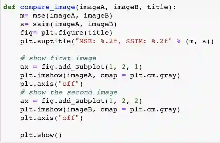 由于SSIM已经通过skimage导入,因此无需进行手动编码。现在创建一个比较函数,该函数的输入为两个图像,分别计算二者的MSE和SSIM,并展示计算结果。