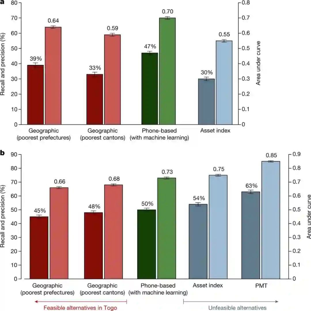 该研究想要实现帮助 100 个最穷州的最穷的人,研究发现,相对于多哥政府的其他可行目标定位方法,基于电话的目标定位方法大大减少了排除误差和包容错误(errors of inclusion)(非穷人被错误地认为有资格),如图 1a 和表 1 所示。
