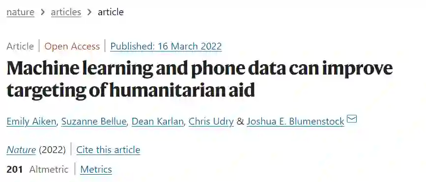 在近日发表在 Nature 上的论文《Machine Learning and Phone Data can Improve Targeting of Humanitarian Aid》中,来自加州大学伯克利分校、德国曼海姆大学、美国西北大学的研究者展示了利用手机网络的数据可以提升人道主义救援的针对性。