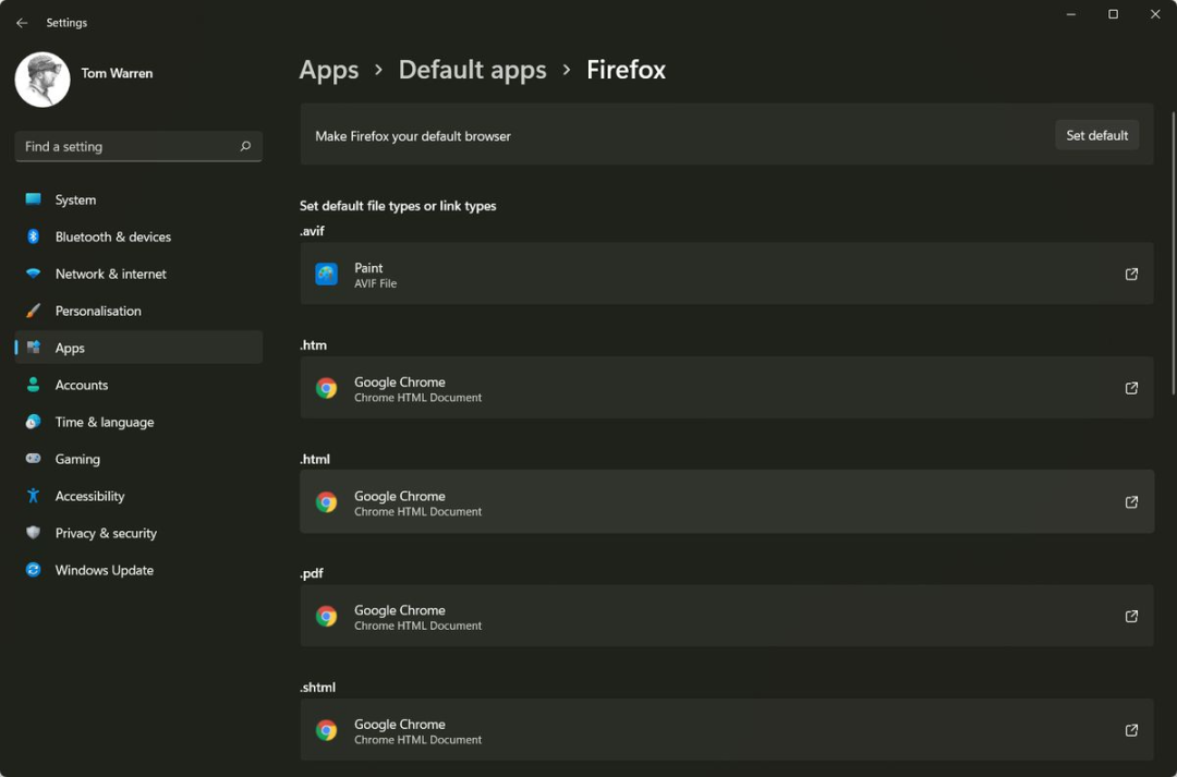 在Windows 11的最新更新中,用户可以进入默认应用程序部分,搜索所选择的浏览器,然后就会出现一个按钮,询问用户是否要将其设置为默认值。更改文件处理程序的所有工作只需单击一下即可完成,相比于以前有很大的改进。