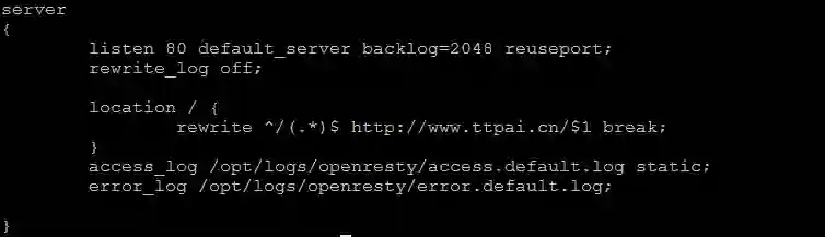 这样做是为了设置backlog,以及启用reuseport功能,backlog是所有虚拟主机公用的,所以当你的Nginx要提供的服务很多时,增加default server中的backlog。加入reuseport可以让所有的worker都监听在80端口,提高Nginx的并发性能,reuseport与accept_mutex是互斥的。另外如果要启用SO_TCPKEEPALIVE机制,需要在listen指令中配置so_keepalive=on