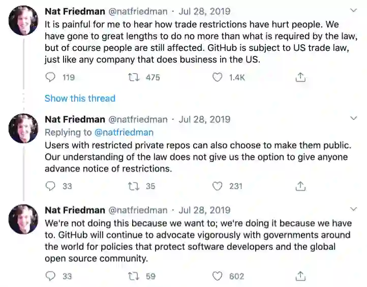 随后GitHub CEO Nat Friedman在推特上表达了歉意,但也表示这种限制措施在一定程度上是「势在必行」的。