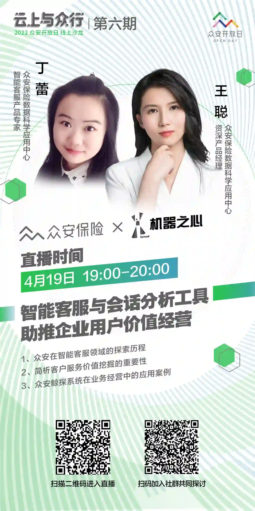 「2022众安开放日线上沙龙-云上与众行」第六期将于4月19日晚7点开启。两位众安保险客服产品专家将从技术角度,介绍交互价值挖掘在众安的落地情况,并详细阐述相关应用案例。