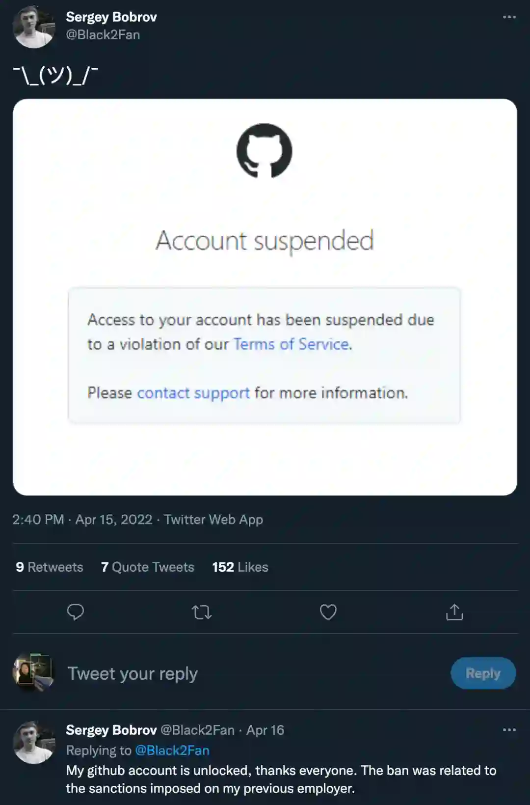 一位开发者在推特上表示,在填写表格后,自己的账号得以解封。之前的封禁与他的前雇主有关。