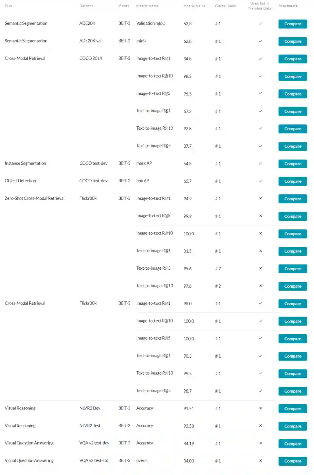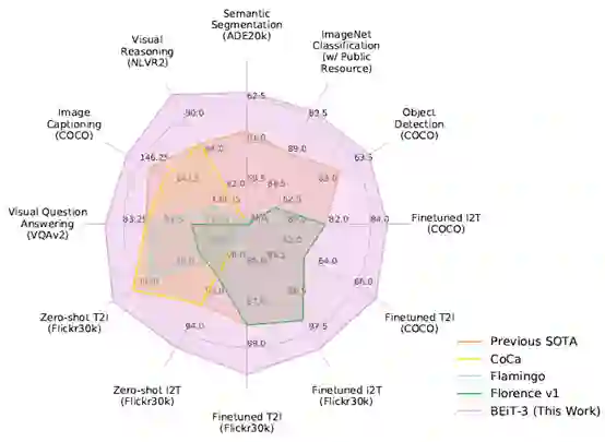 近期,微软亚洲研究院联合微软图灵团队推出了最新升级的 BEiT-3 预训练模型,在广泛的视觉及视觉-语言任务上,包括目标检测(COCO)、实例分割(COCO)、语义分割(ADE20K)、图像分类(ImageNet)、视觉推理(NLVR2)、视觉问答(VQAv2)、图片描述生成(COCO)和跨模态检索(Flickr30K,COCO)等,实现了 SOTA 的迁移性能。BEiT-3 创新的设计和出色的表现为多模态研究打开了新思路,也预示着 AI 大一统渐露曙光。(点击阅读原文,查看 BEiT-3 论文)