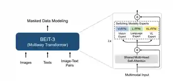 在 BEiT 的基础上,微软亚洲研究院的研究员们在 BEiT-2 中进一步丰富了自监督学习的语义信息(了解更多信息,请查看 BEiT-2 论文原文:https://arxiv.org/abs/2208.06366)。近日,研究员们又将其升级到了 BEiT-3。BEiT-3 利用一个共享的 Multiway Transformer 结构,通过在单模态和多模态数据上进行掩码数据建模完成预训练,并可迁移到各种视觉、视觉-语言的下游任务中。