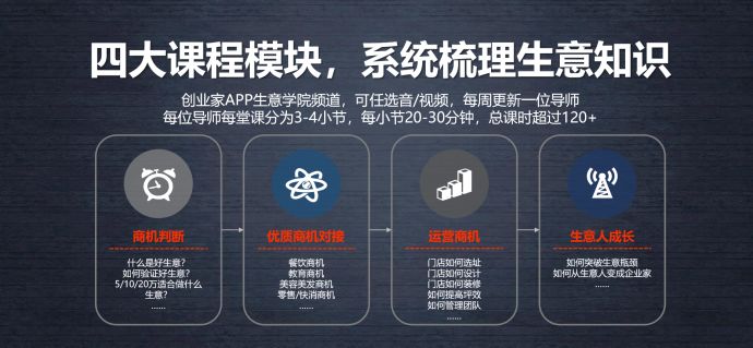 “生意学院”的课程分为30堂共120节课程,每周日更新。课程分为线下大课和线上录播两种形式,整个课程分为四大模块——商机判断、优质商机对接、运营商机、生意人成长。