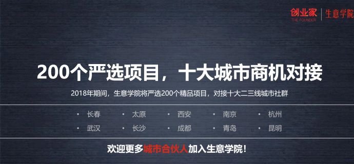 生意学院还会为学员提供一个服务:200个严选商机的对接。酒仙网、e袋洗、名创优品、饿了么、美团点评等优质商机将和生意学院一起,共同拓展全国10个生意城市,这10个城市包括长春、太原、西安等。
