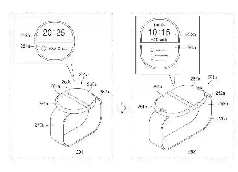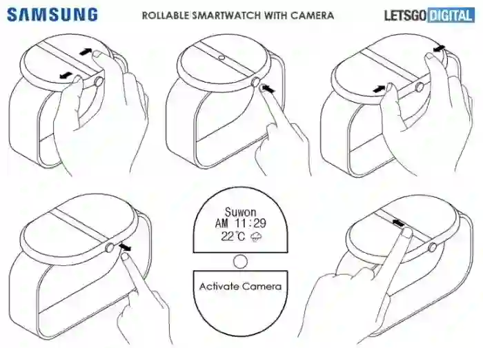 此外,中间的框架也容纳了一个摄像头,可以选择内置几个摄像头传感器甚至是闪光灯。这款相机可以同时拍摄照片和视频。目前这只是一个专利,虽然已经详细描述了各种操作的可能性,但尚不清楚三星是否打算量产这款智能手表。也许,三星会先推出一款卷轴屏手机,才推出这款智能手表。
