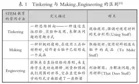 Tinkering与其他STEM教育方法存在交叉和协同作用。Martinez和Stager在Invent to Learn:Making,Tinkering,and Engineeringin the Classroom一书中,对Tinkering与STEM中常用的Making'Engineering作了区分,如表1所示。